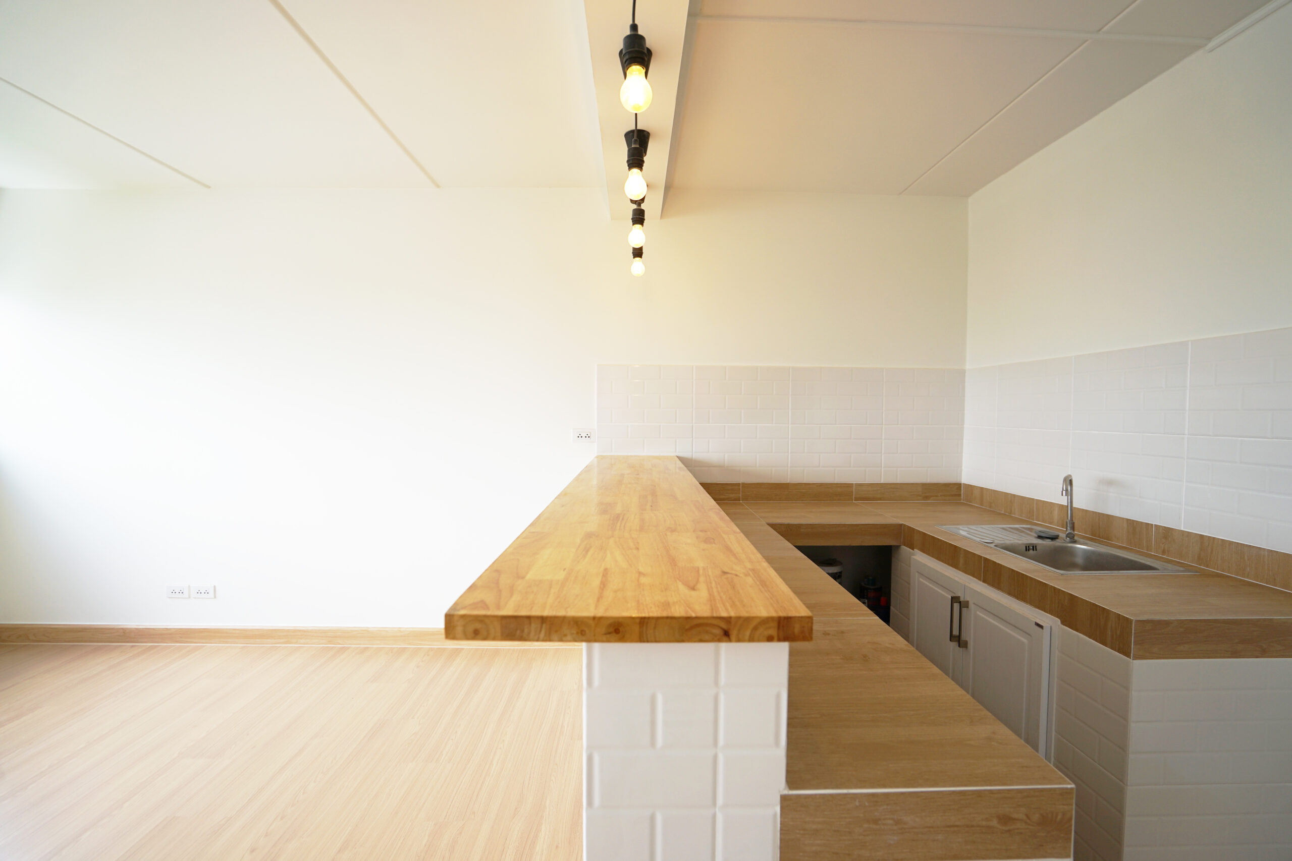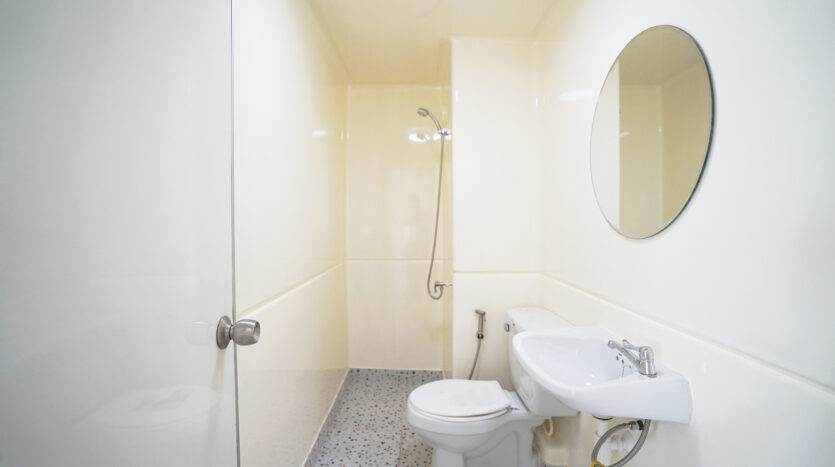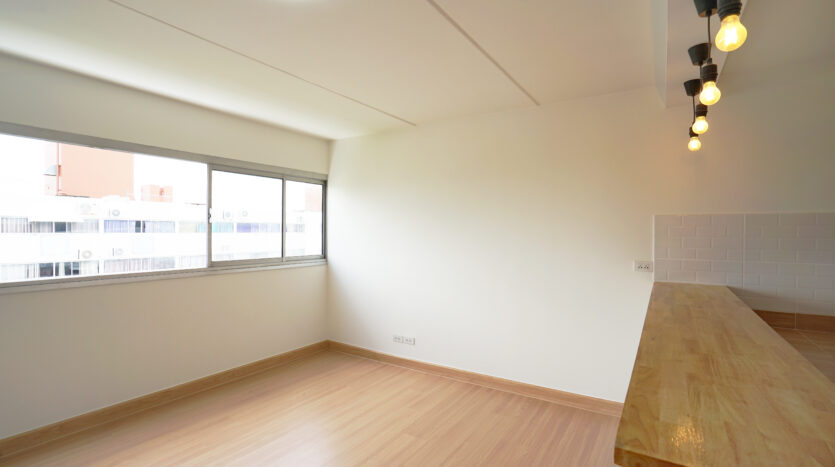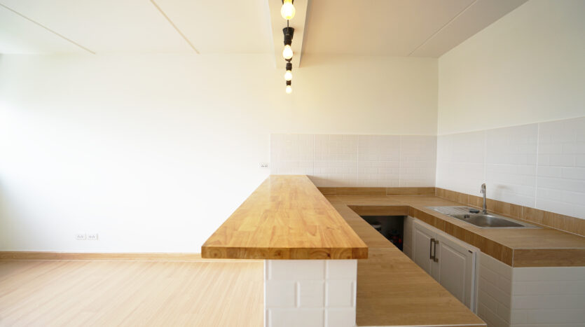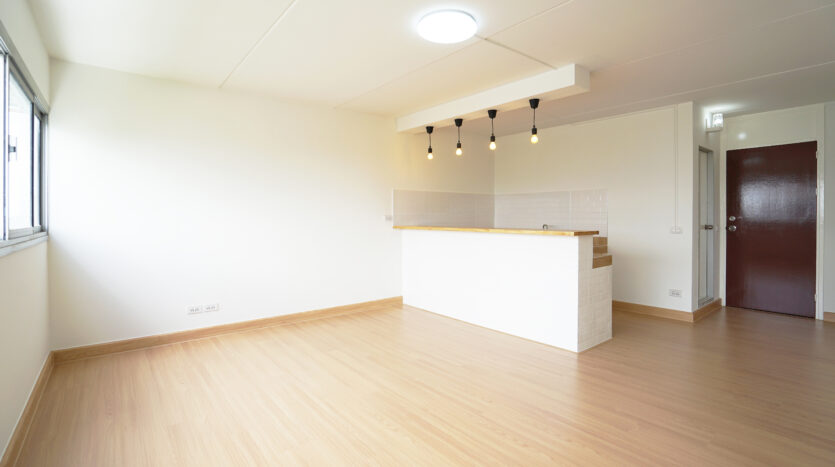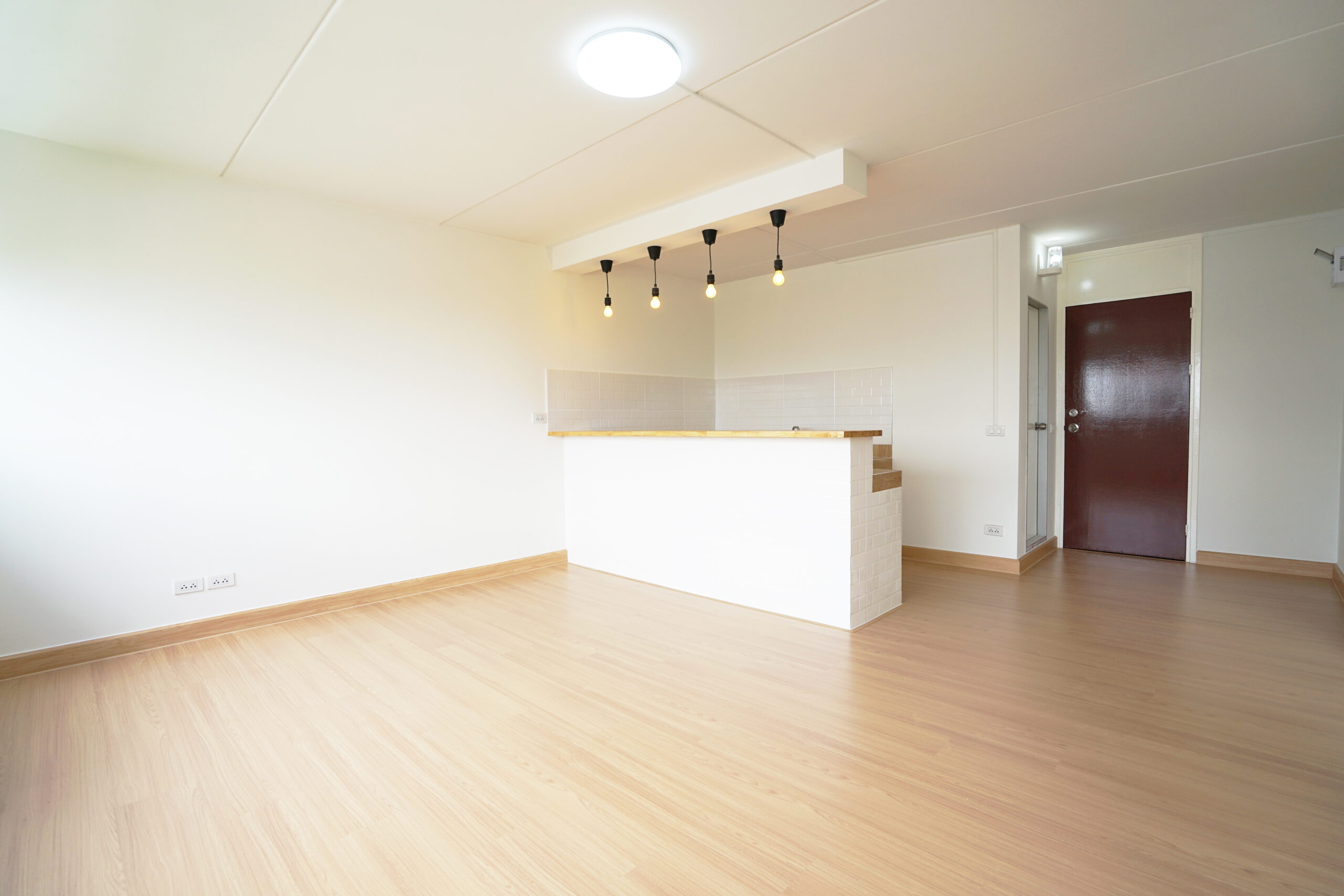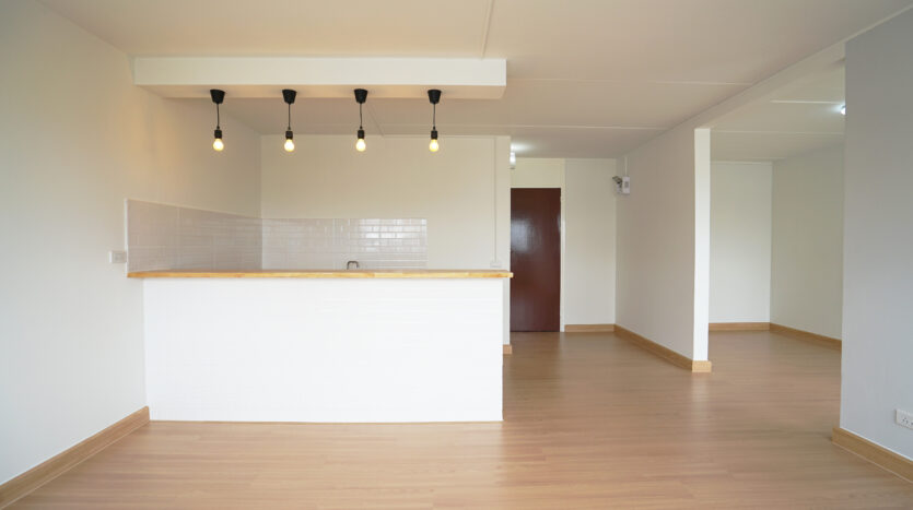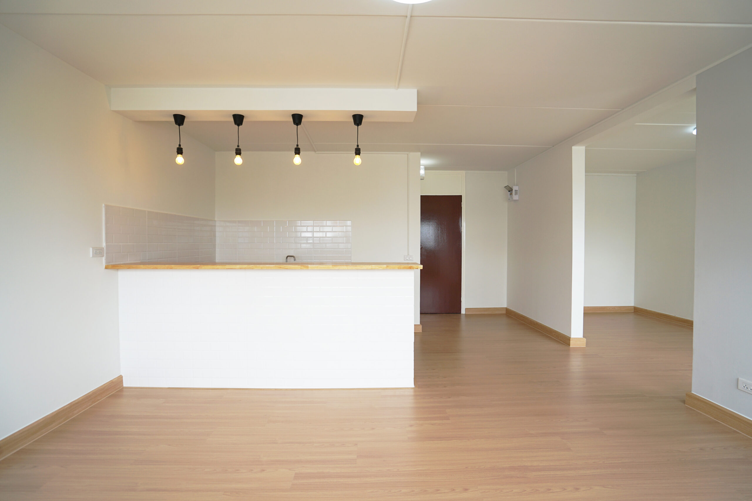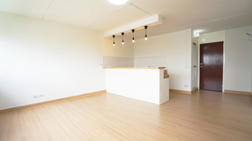 ภายในห้อง ตกแต่งพื้นด้วยลามิเนต โดยเลือกเป็นสีไม้เพื่อให้ความรู้สึกอบอุ่นและเพิ่มความมินิมอล แบ่งห้องนอนออกเป็นสัดส่วน ห้องน้ำตกแต่งปูกระเบื้องใหม่สวยงาม และ Built-in เค้าเตอร์ห้องครัวขนาดพอเหมาะพร้อมใช้งาน