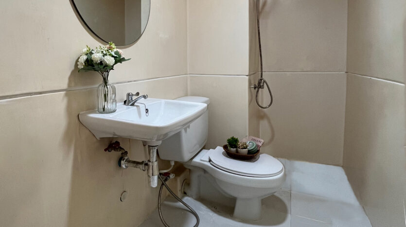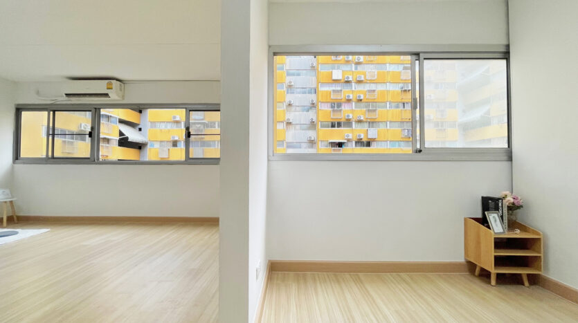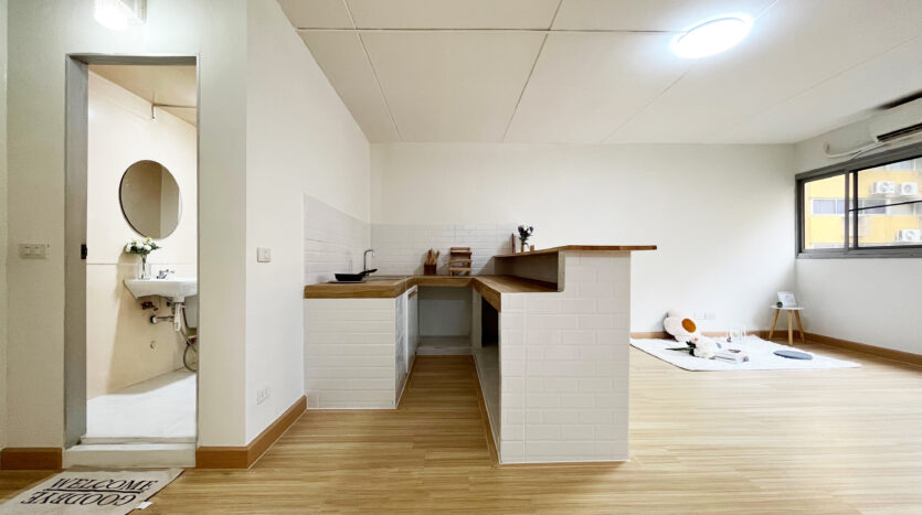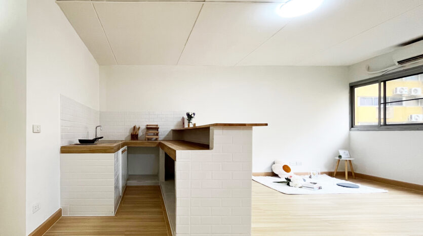 ภายในห้อง ตกแต่งพื้นด้วยลามิเนต โดยเลือกเป็นสีไม้เพื่อให้ความรู้สึกอบอุ่นและเพิ่มความมินิมอล แบ่งห้องนอนออกเป็นสัดส่วน ห้องน้ำตกแต่งปูกระเบื้องใหม่สวยงาม และ Built-in เค้าเตอร์ห้องครัวขนาดพอเหมาะพร้อมใช้งาน
